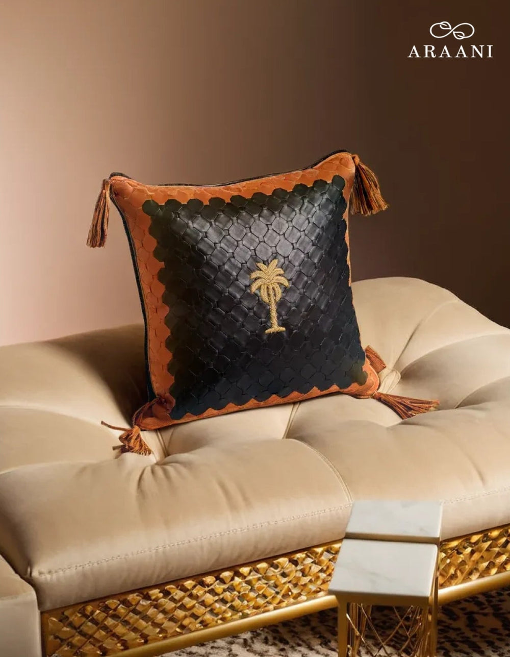 Experience sustainable luxury with our premium Moroccan-style cushion, crafted from rescued cow leather. The intricate handwoven design, complemented by the elegant zari-embroidered palm tree and rich cotton jute back, adds a touch of timeless elegance to any space. Each piece reflects artisan craftsmanship at its finest, offering a sophisticated blend of heritage and modern luxury.