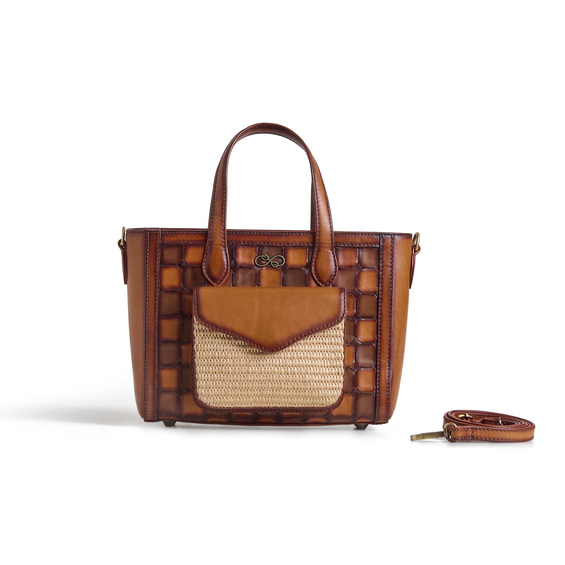 a blend of mosaic pattern interlocked leathers and golden foiled raffia, exuding the golden hour warmth