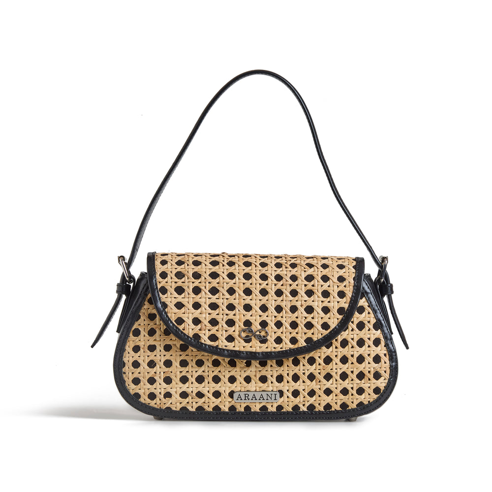 A blend of natural raffia and rescued leather on this exquisite shoulder bag.