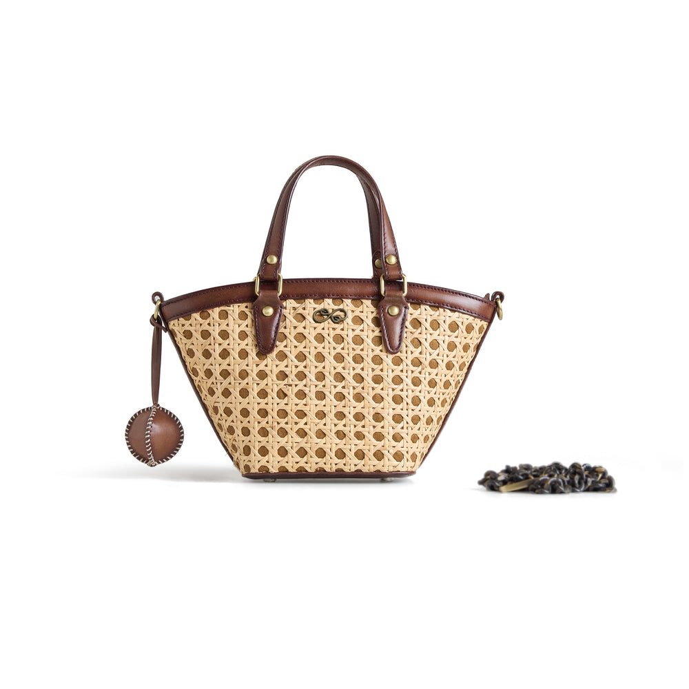 Cane weave embellished with leather finishings. Features a detachable chain for crossbody