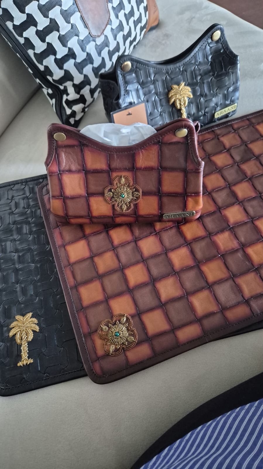 Intricate wire and thread work on leather with a turquoise stone as a highlighter in the center