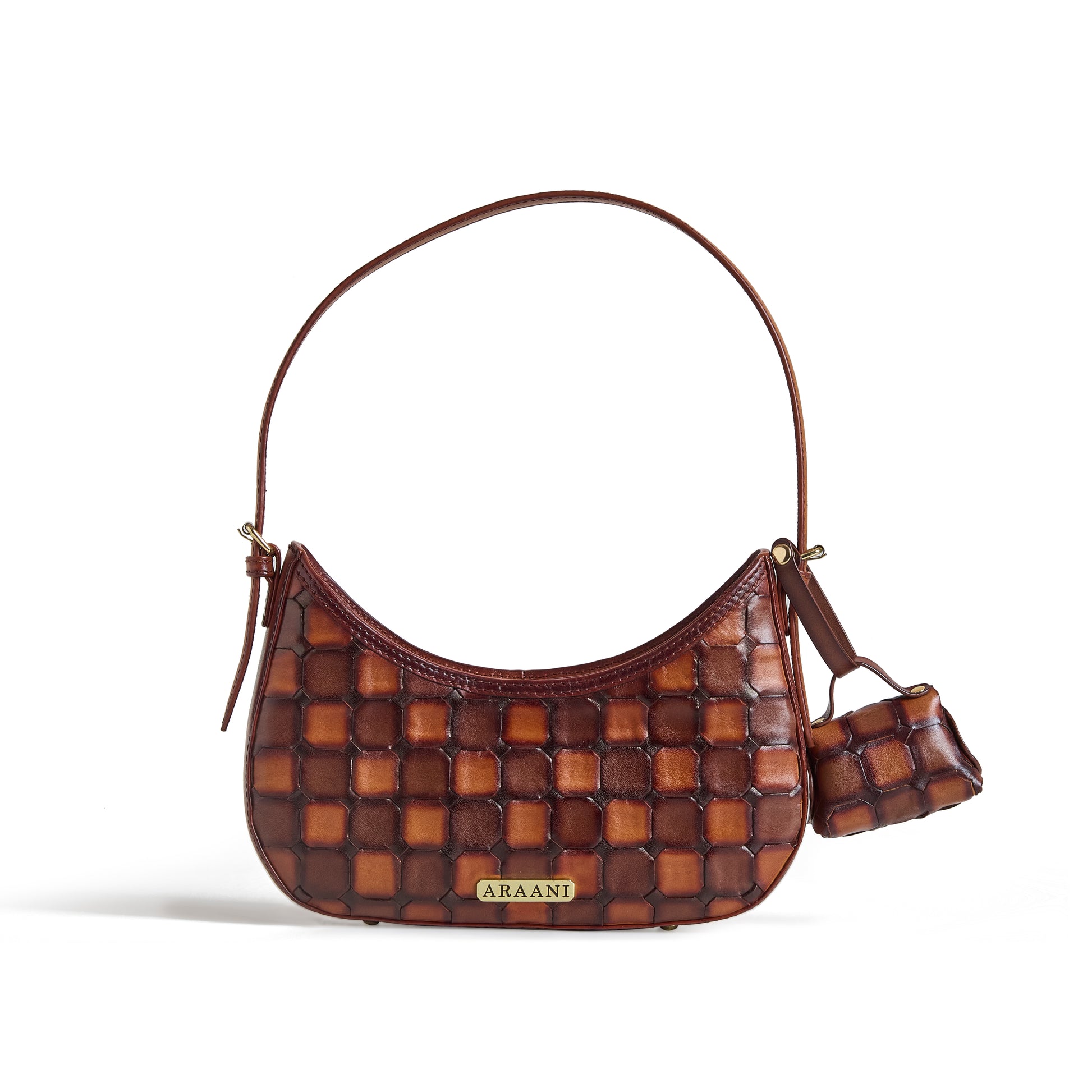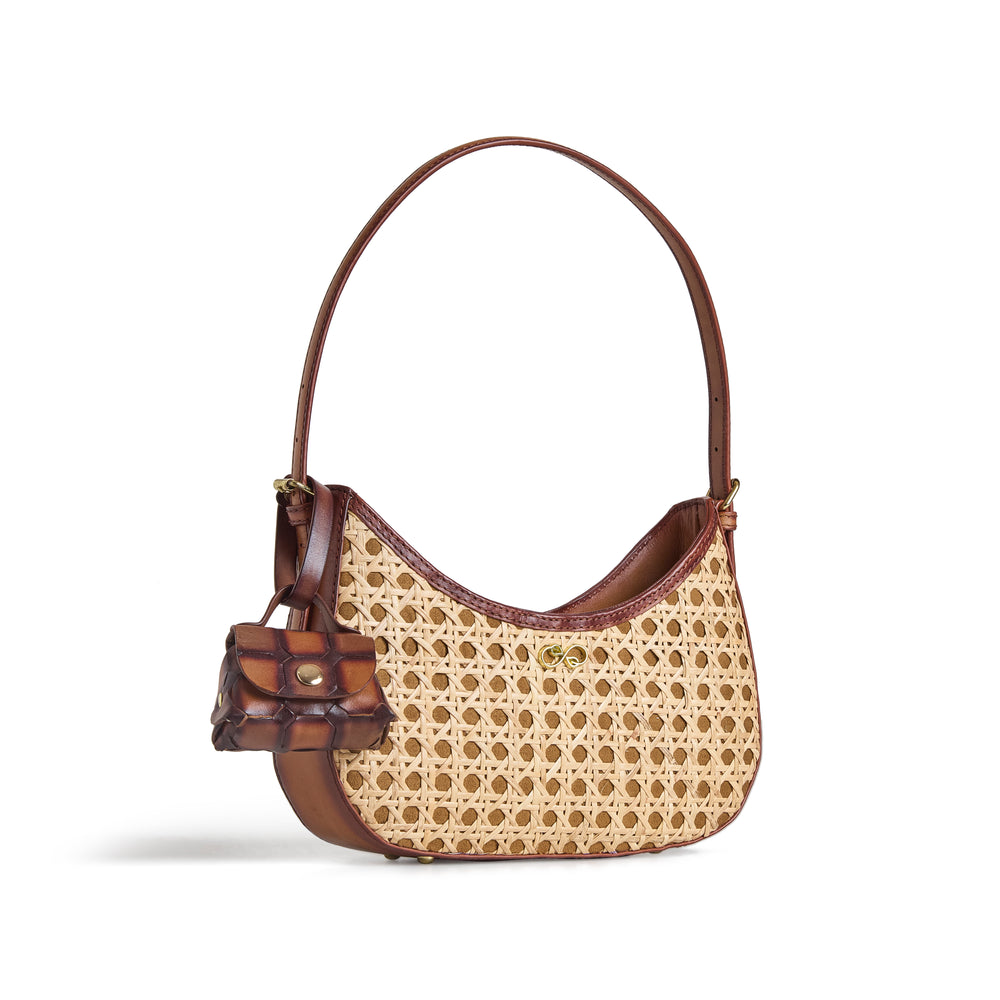 Dual effect, versatile shoulder bag with a side key pouch. Made in natural rattan and rescued leather