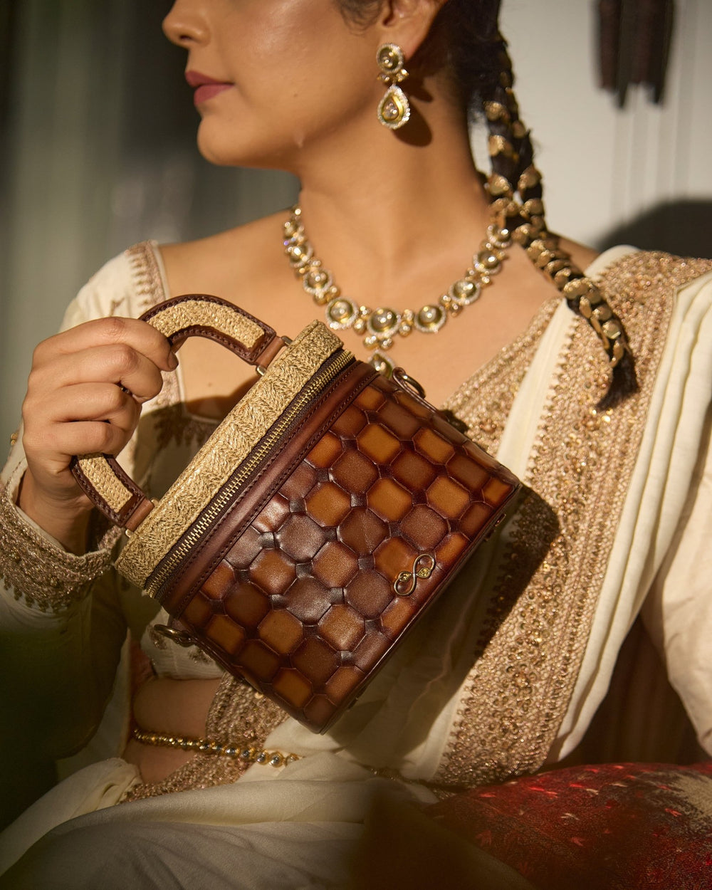 Made in a combination of hand woven rescued cow leather, and foiled raffia lid and handle.