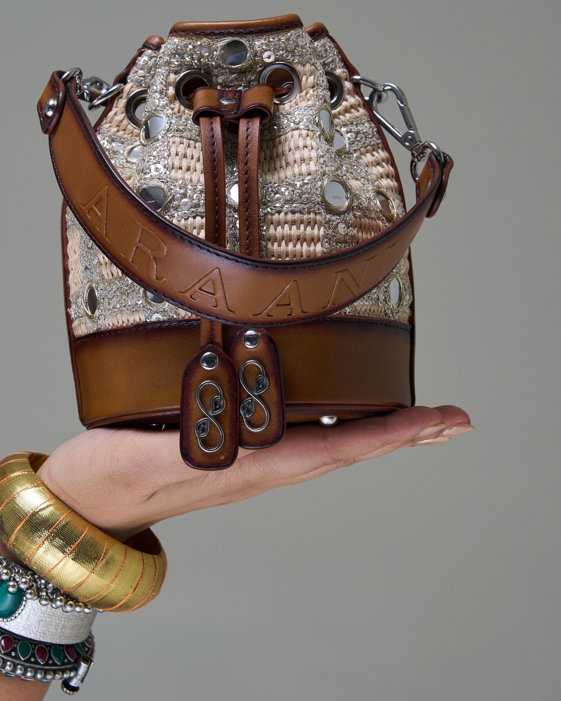 Raffia's natural weave paired with luminous sparkle. Handle and base in beautiful VT leather