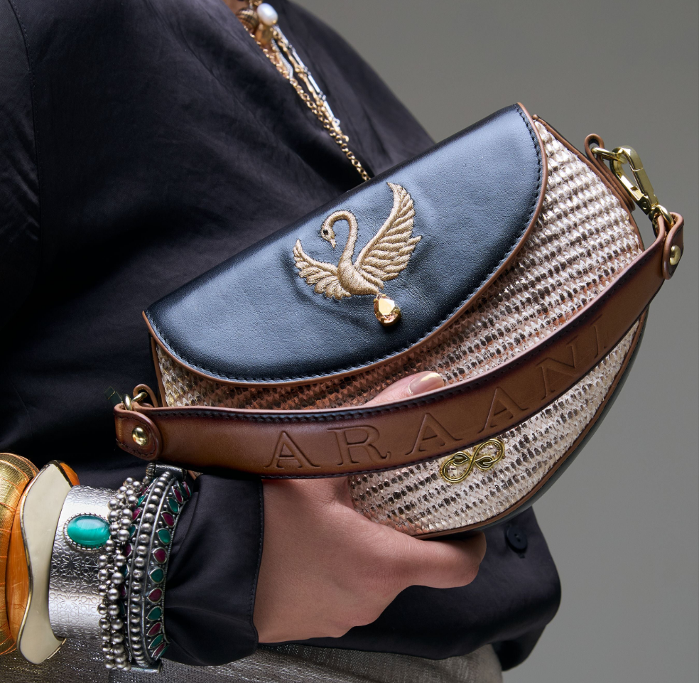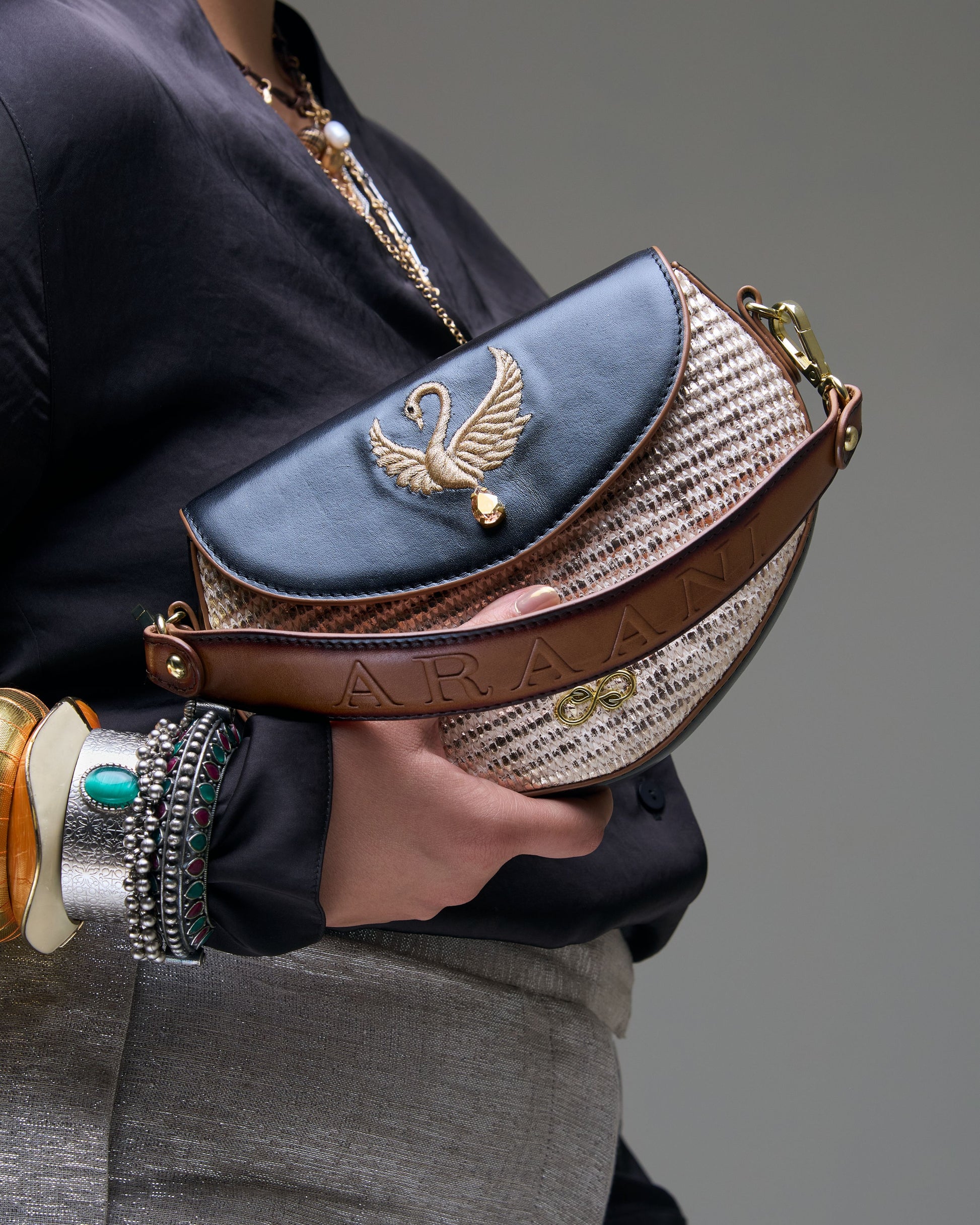 Feminine flair with hand embroidered swan on leather flap, combined with raffia body and leather handle