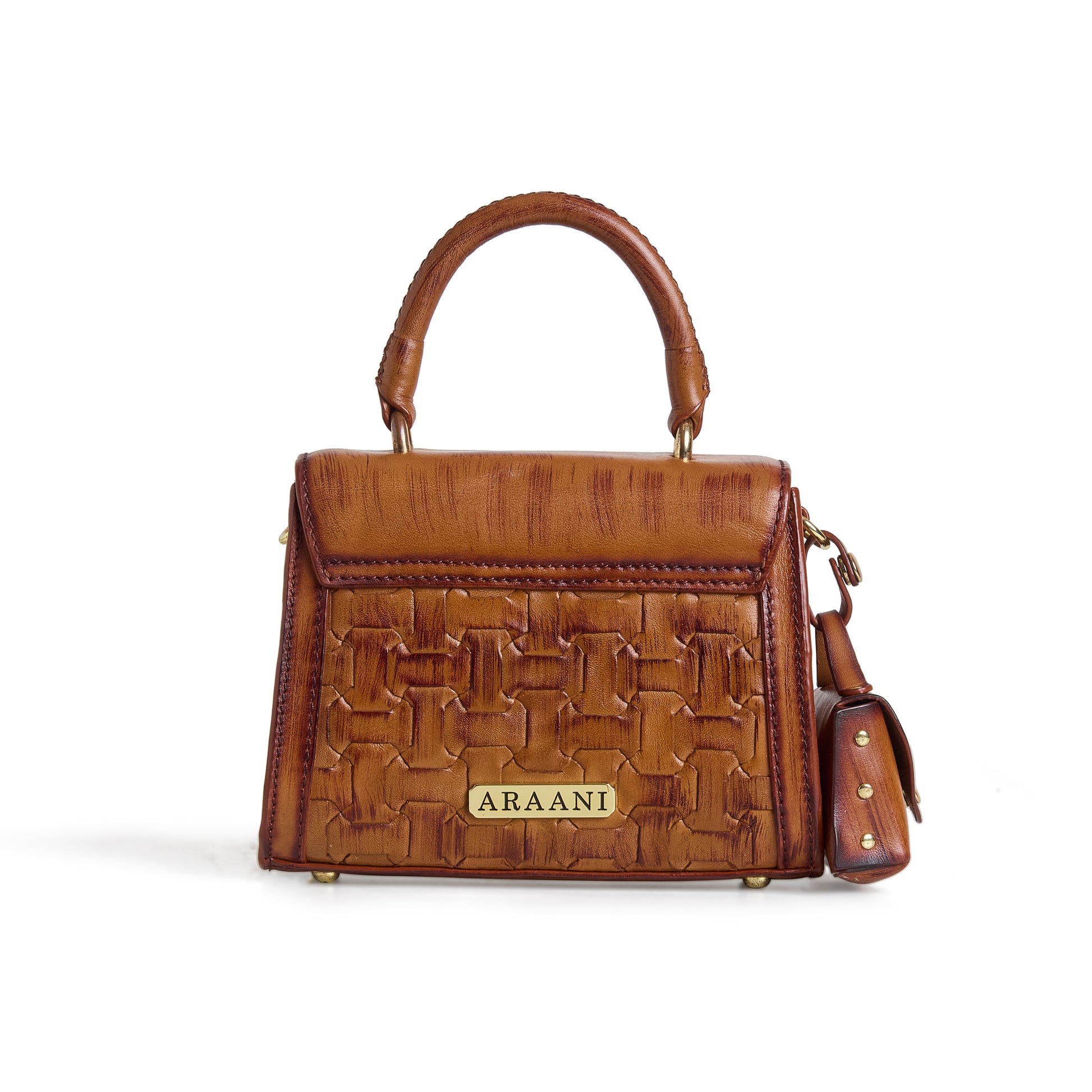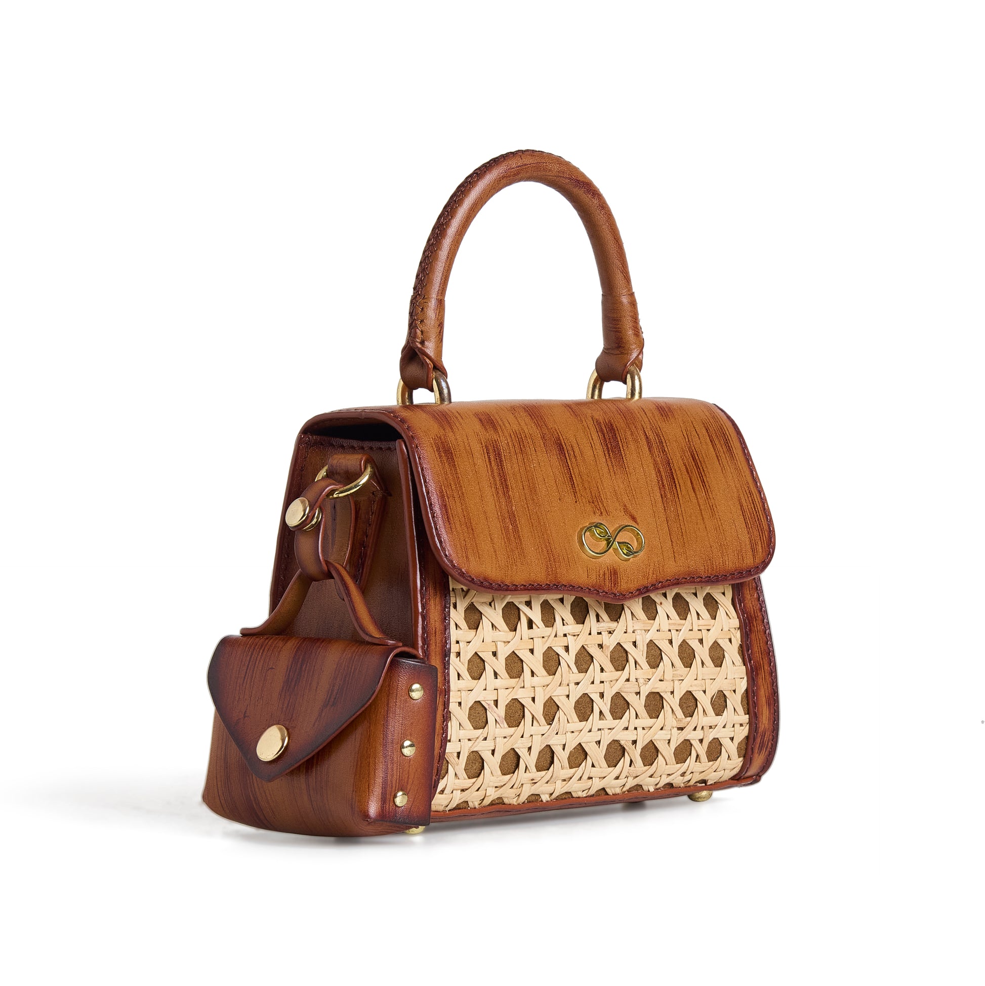Stellar mini tote in hand woven cow leather back and natural rattan front. Features a key bag and a detachable chain for cross body.